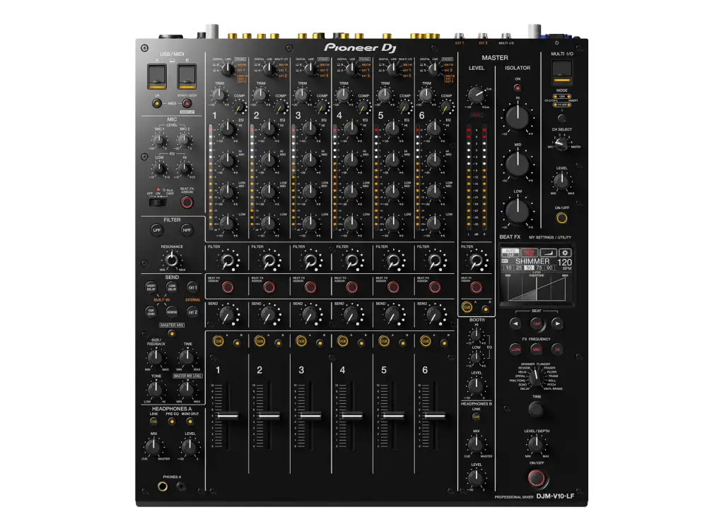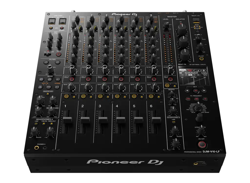 Pioneer DJ DJM-V10-LF, profesyonel DJ’ler için tasarlanmış, 6 kanallı üst seviye bir DJ mikseridir. DJM-V10 modelinin geliştirilmiş versiyonu olan DJM-V10-LF, 60 mm uzun atımlı fader’lara sahip olmasıyla dikkat çeker. Bu sayede miksaj sırasında daha hassas geçişler ve derin kontrol imkânı sağlar. Stüdyo kalitesinde 64-bit miksaj motoru, gelişmiş filtreler, EQ ve efekt seçenekleriyle sahnede yaratıcılığı üst düzeye çıkarır. Pro DJ Link, send/return bağlantıları ve çok yönlü routing özellikleriyle modern DJ performanslarının vazgeçilmez merkezidir.